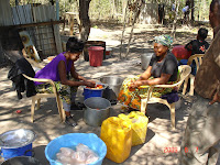 We had a wonderful day of classes on the first day! The weather was great (about 78-80 degrees and sunny). All 13 computer skill students (ranging in age from 19—48) were totally “green” to computer use—and were able to get immersed in the use of the laptop (keyboard, mouse, screen, understanding software, and an overview of the many capabilities of computing) use, and raved about it! “The best class I’ve ever taken” could be heard from some. Kristine had an enthusiastic group of students (age 23-66) that were anxious to learn English. The curriculum we decided on was teaching vocabulary words from 5 of the hymns in our UCG hymnal. Notebooks of words, picture, and drawing paper were given to each student. Kristine had picture games, charades, drawing the words, etc. throughout the day. I was able to assist Kristine with songleading, explaining Bible verses in which the words are used, and assisting with a few of the games. We ended classes about 5pm. After a short break, prior to dinner--we showed the entire group (with “big screen” on white shower curtain…and projector) one of the inspiring installments of PLANET EARTH (Discovery C